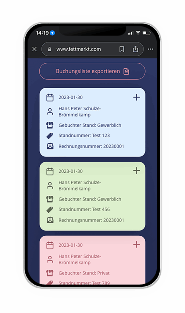 Jede Buchung wird automatisch bestätigt, und die Aussteller erhalten alle relevanten Informationen direkt per E-Mail. Gleichzeitig werden Sie als Veranstalter in Echtzeit informiert, sodass keine Buchung verloren geht und freie Stände sofort aktualisiert werden.