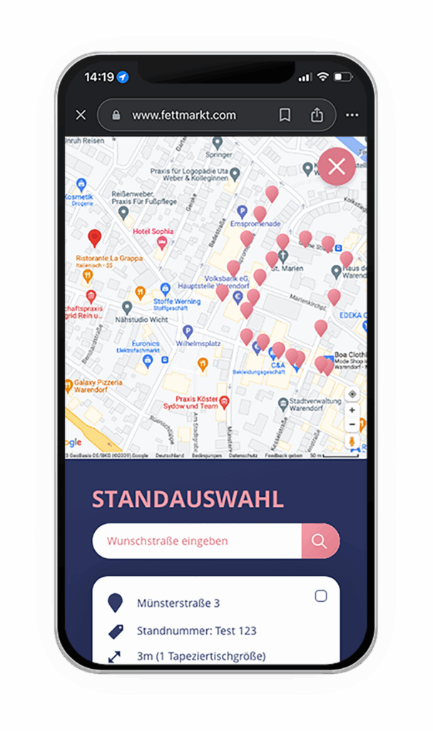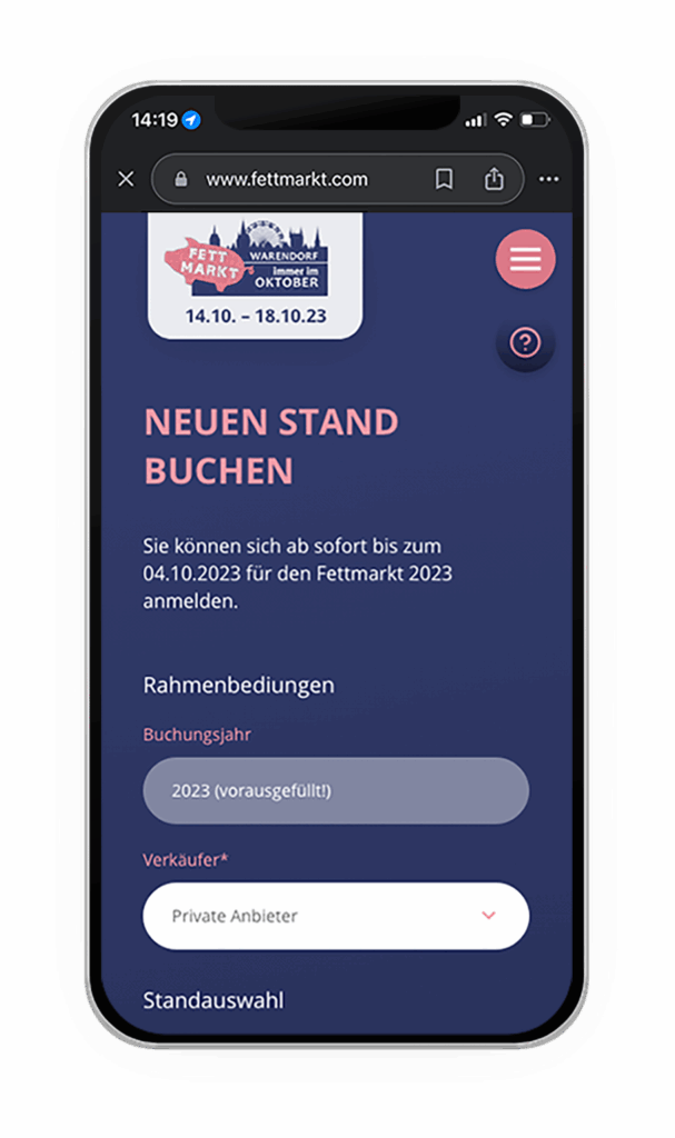 Die Buchung eines Standes war noch nie so einfach: Über die interaktive Karte wählen Besucher direkt ihren Wunschstand aus – freie Plätze sind klar gekennzeichnet und können sofort reserviert werden. Im Anschluss erfolgt die sichere Bezahlung bequem online, etwa per PayPal oder Kreditkarte.